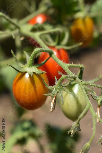 Tomato plant with young green and red tomatoes growing in the soil in summer. Concept of the farming and gardening. Cultivating tomatoes in garden, at home or in greenhouse. Growing own vegetables.