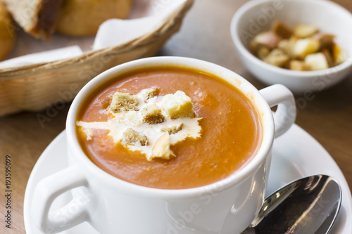 Tomato puree soup with cream and crackers in a white plate on the table