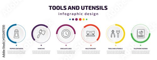 tools and utensils infographic element with icons and 6 step or option. tools and utensils icons such as pepper container, hand axe, circular clock, hole puncher, tools utensils, telephone agenda