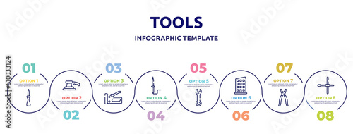 tools concept infographic design template. included null, sanding hine, big stapler, solder, adjustable wrench, rectangles, open pliers, wheelbrace icons and 8 option or steps.