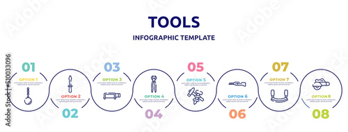 tools concept infographic design template. included wrecking ball, screwdriver pointing up, hacksaw with handle, nail puller, construction tools, stationery knife, mezzaluna, electric saw icons and