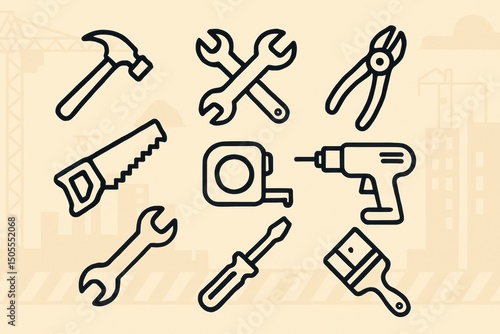 Tools for Construction Tasks Showcasing Diverse Instruments Including Saw, Hammer, Screwdriver, and Measuring Tape in a Minimalist Design