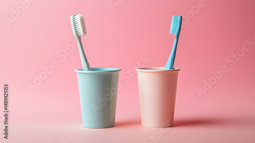 Toothbrush Duo: Two toothbrushes in pastel cups stand poised against a vibrant pink backdrop, inviting viewers to reflect on the purity and precision of personal hygiene.