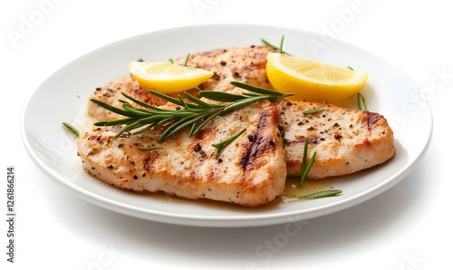 Top a plate of freshly cooked meat with rosemary leaves and sprinkle with a little lemon juice. Generative AI