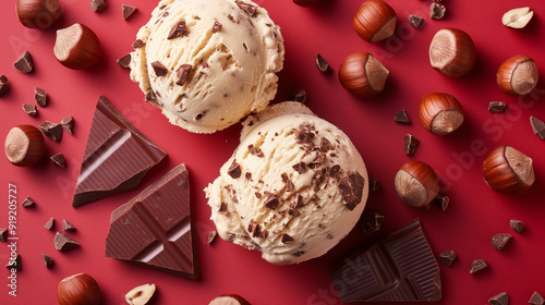 top down view of a tempting ice cream scoop garnished with crunchy hazelnuts, presented on a vibrant red background, showcasing the dessert rich textures and colors
