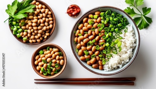 Top Down View of Natto Bowl with Rice, Green Onions, and Fresh Ingredients for Healthy Eating