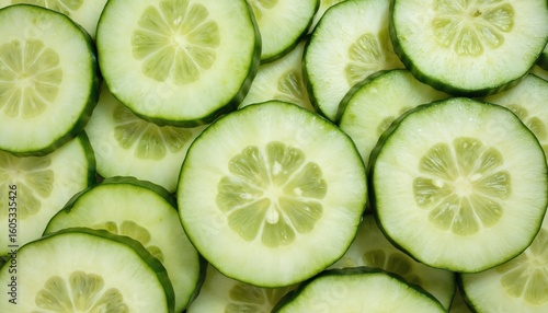 Top view close-up of fresh green cucumber slices, healthy texture, vibrant color. Organic slices, perfect for salads, key ingredient for vegetarian diets, raw food preparations.