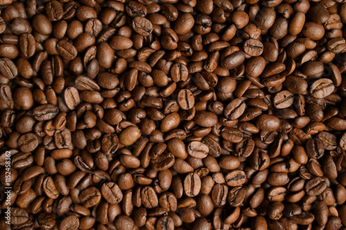 Top view closeup roasted coffee beans. Horizontal copy space background, cover, backdrop, texture. Place for adding text or design