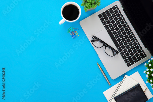 Top view desk,Modern office desk Workspace with laptop computer, coffee cup, glasses,notebook and office supplies for Working background concept,Blue glass table top.