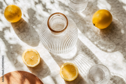 top view flat lay composition with lemons and glass carafe of lemon water on a marble surface. luxurious lemon still