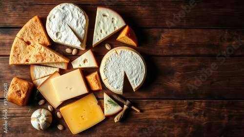 Top view flat lay of various kinds of cheese on the table with copy space. Dairy product variety food ingredient background.