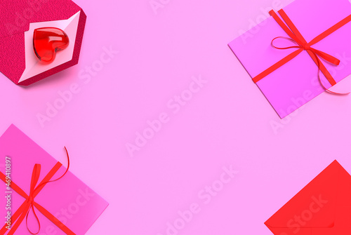 Top view mail letter box gift heart ribbon red pink pastel background wallpaper empty copy space decoration ornament merry christmas happy new year valentine day wedding anniversary romance.3d render