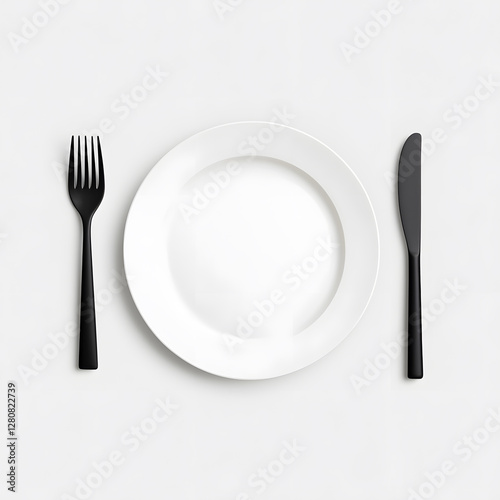 Top view mock up dinner plate, minimalist, modern, black and white, isolated on white background