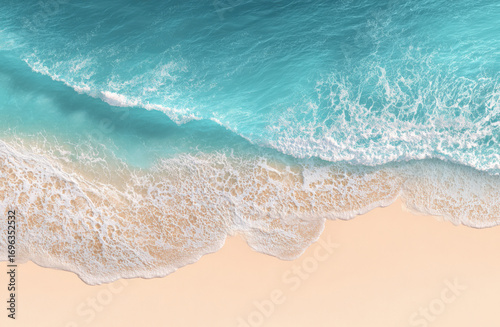 Top view of a beautiful sandy beach with waves and sea foam, flat lay, copy space for text, summer background