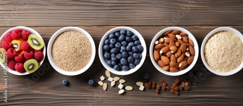 Top view of a bowl with homemade granola, yogurt, berries on a dark stone concrete background, alongside a cranberry and apple crumble topped with almond flakes and oat. Displaying a copy space image.