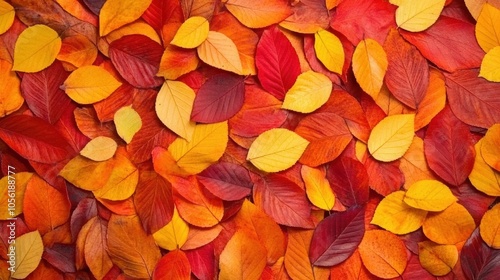 Top view of a forest floor covered with fallen autumn leaves in vibrant shades of red, orange and yellow