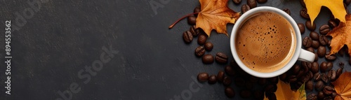 Top view of a hot coffee cup with coffee beans and autumn leaves on a dark background. Cozy autumn concept.