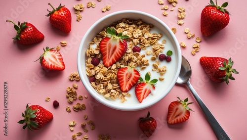 Top view of a nutritious breakfast bowl featuring granola, yogurt, and fresh strawberries on a pink background with ample copyspace.