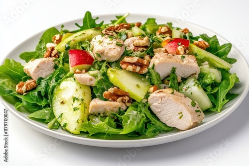 Top view of a plate featuring Waldorf salad with assorted apples celery lettuce chicken arugula and walnuts on a white table