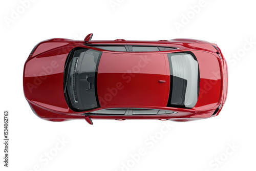 Top view of a sleek red car isolated on a white background showcasing its modern design and features with a focus on details and distinct lines