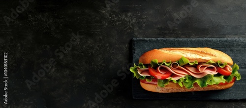 Top view of a sub sandwich with ham cheese tomato and lettuce on a black background with copy space image