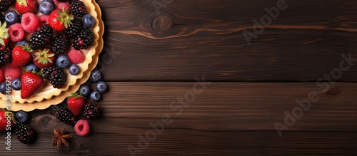 Top view of a tart garnished with berries and cookies on a wooden surface creating a visually appealing copy space image