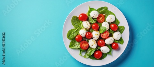 Top view of a vibrant caprese salad with red cherry tomatoes and white mozzarella balls nestled on fresh green spinach leaves, presented on a round white plate against a light blue background.