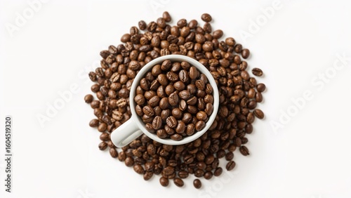 Top view of a white cup filled with roasted coffee beans placed on a white background surrounded by scattered coffee beans
