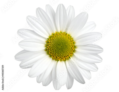 top view of a white daisy flower with yellow green center on isolated background, clean botanical element for natural and minimalist design