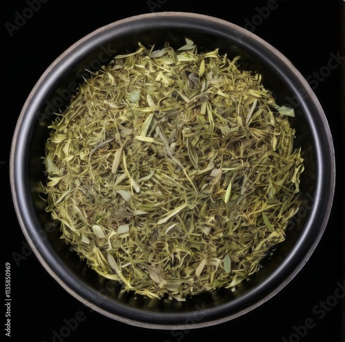 Top view of black bowl filled with finely chopped dried herbs on smooth surface, against black background.