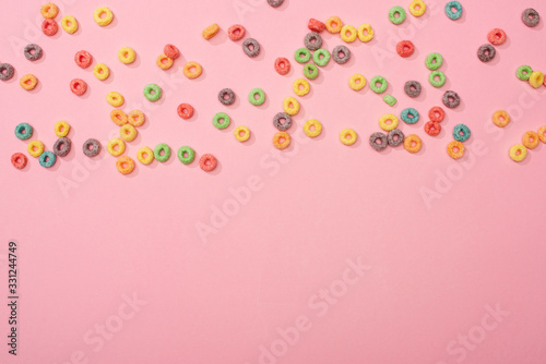 top view of bright multicolored breakfast cereal scattered on pink background