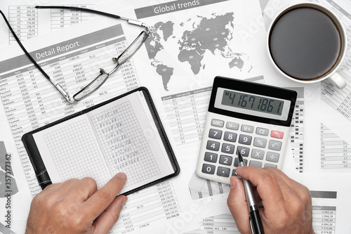 Top view of businessman working with financial statements. Modern black office desk with notebook, pencil and a lot of things. Flat lay table layout.