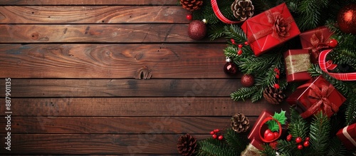 Top view of Christmas gift boxes and a fir tree on a wooden background providing copy space in the image