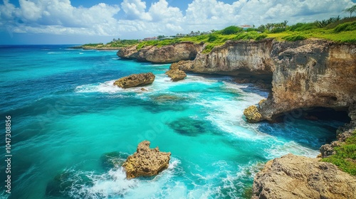 Top view of coastal cliffs with turquoise waters crashing into the rocky shore.