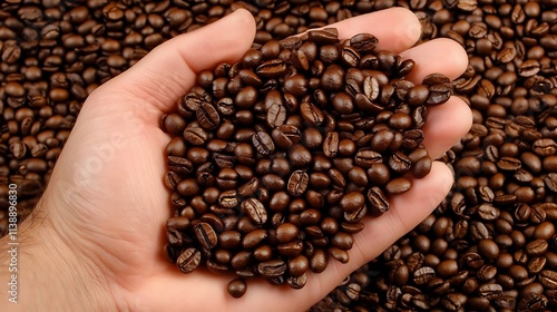 Top view of coffee beans resting in a hand with a rich coffee background. Perfect for themes like coffee culture, food, and beverages.