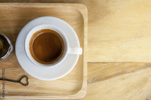Top view of coffee cup on wood table