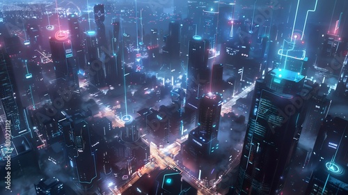 Top view of cyberpunk city, expansive view, beautiful landscape of skyscrapers and lights
