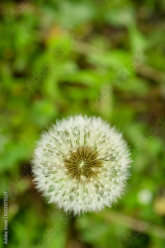 Top view of dandelion on cloudy spring day with blurred green grass in background