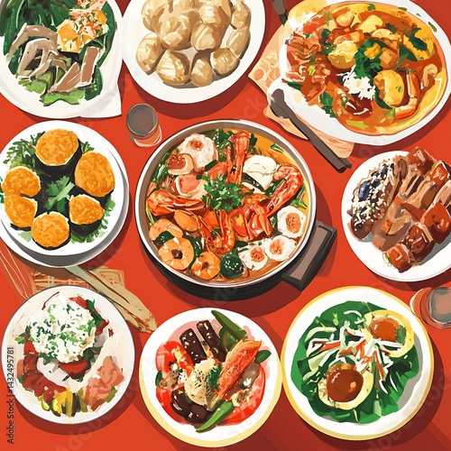 Top View Of Delicious Asian Cuisine Dishes On A Red Tablecloth Background