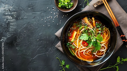 Top view of delicious Asian noodle soup with chopsticks on dark background. Traditional Japanese ramen with chicken, vegetables and greens.