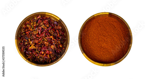 Top view of dry red chili pepper slices and powder in a round wooden bowl isolated on white background.