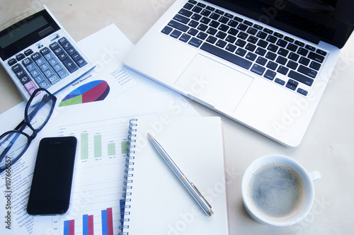 Top view of flat lay laptop with smartphone ,blank notebook,calculator and small green plant