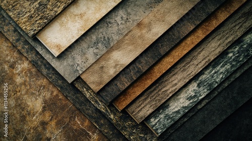 Top view of flooring material samples, featuring vinyl, laminate, and carpet textures laid out side by side, showcasing the distinct patterns and finishes of each material, perfect for interior design