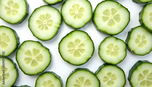 Top view of fresh cucumber slices arranged in seamless pattern on white background. Vibrant green, raw vegetable slices represent healthy eating, organic produce, vegan food options. Ideal for