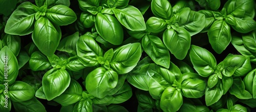 Top view of fresh green basil leaves on a white background creating a copy space image