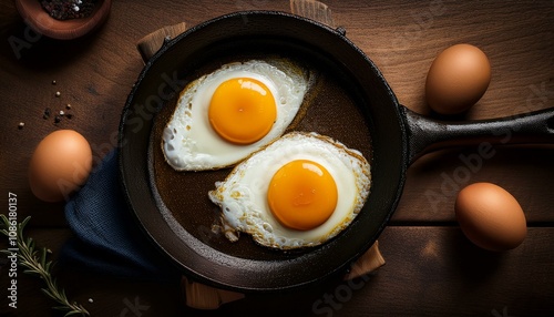top view of fried eggs in a cast iron pan a delicious morning breakfast scene with rustic charm and golden yolk highlights