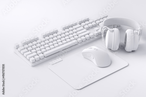 Top view of gamer workspace and gear like mouse, keyboard, joystick