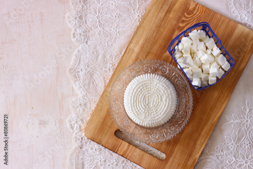 top view of greek cheese and bulgarian cheese on wooden table ov