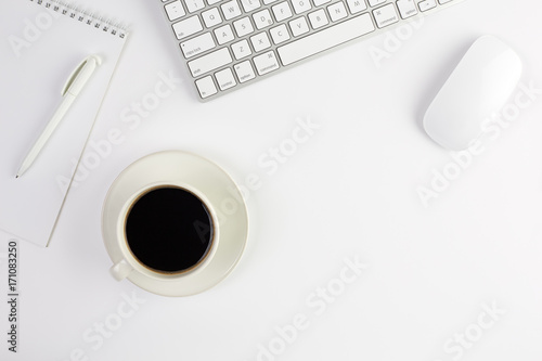Top view of keyboard, computer mouse, blank notebook with pen, cup of coffee on white background