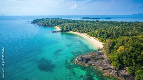 Top view of Koh Thmei, with its turquoise waters, sandy beaches, and dense forests teeming with wildlife.